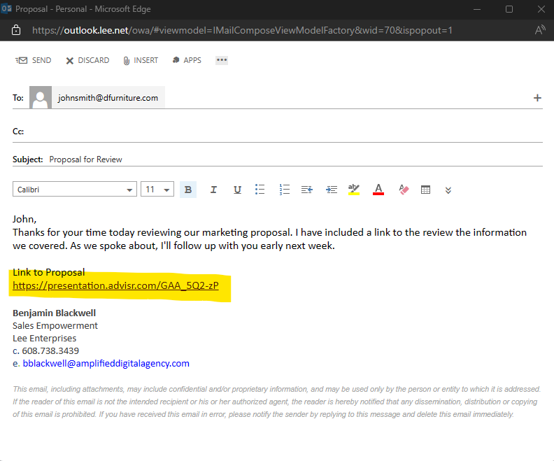Elevate client engagement by sending the Presentation URL via email. Clients can conveniently review proposals at their own pace, providing them with a user-friendly and accessible platform for collaboration.