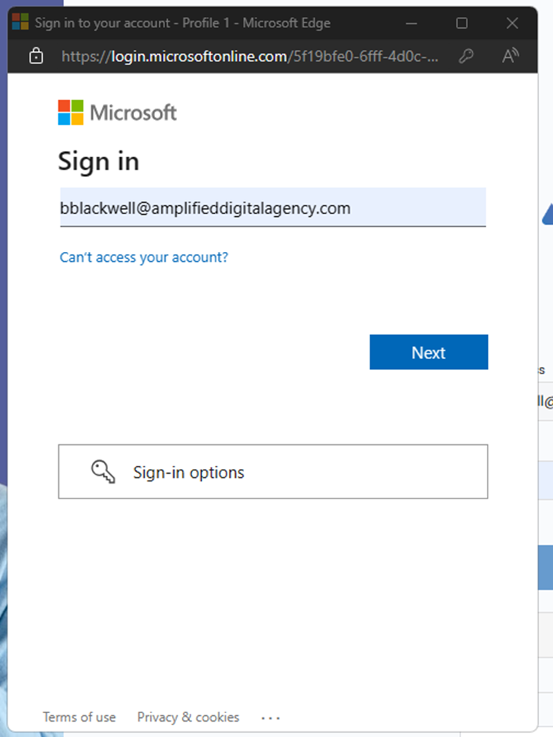Microsoft will prompt you again for your work email address, enter it on the pop-up then click next.