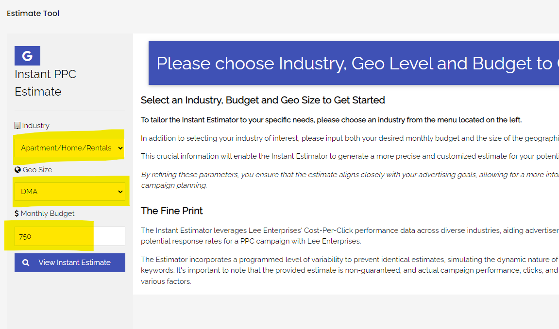 Input the relevant details to tailor the estimation to the specific campaign. Choose the industry related to the campaign, specify the geographic size, and enter the monthly budget you want to estimate.