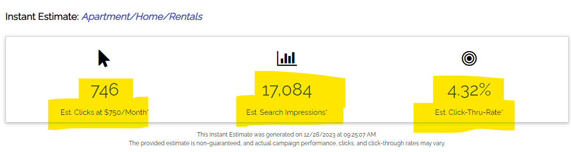 The tool will generate an estimate that predicts the number of clicks, impressions, and click-through rate (CTR) based on the entered information.