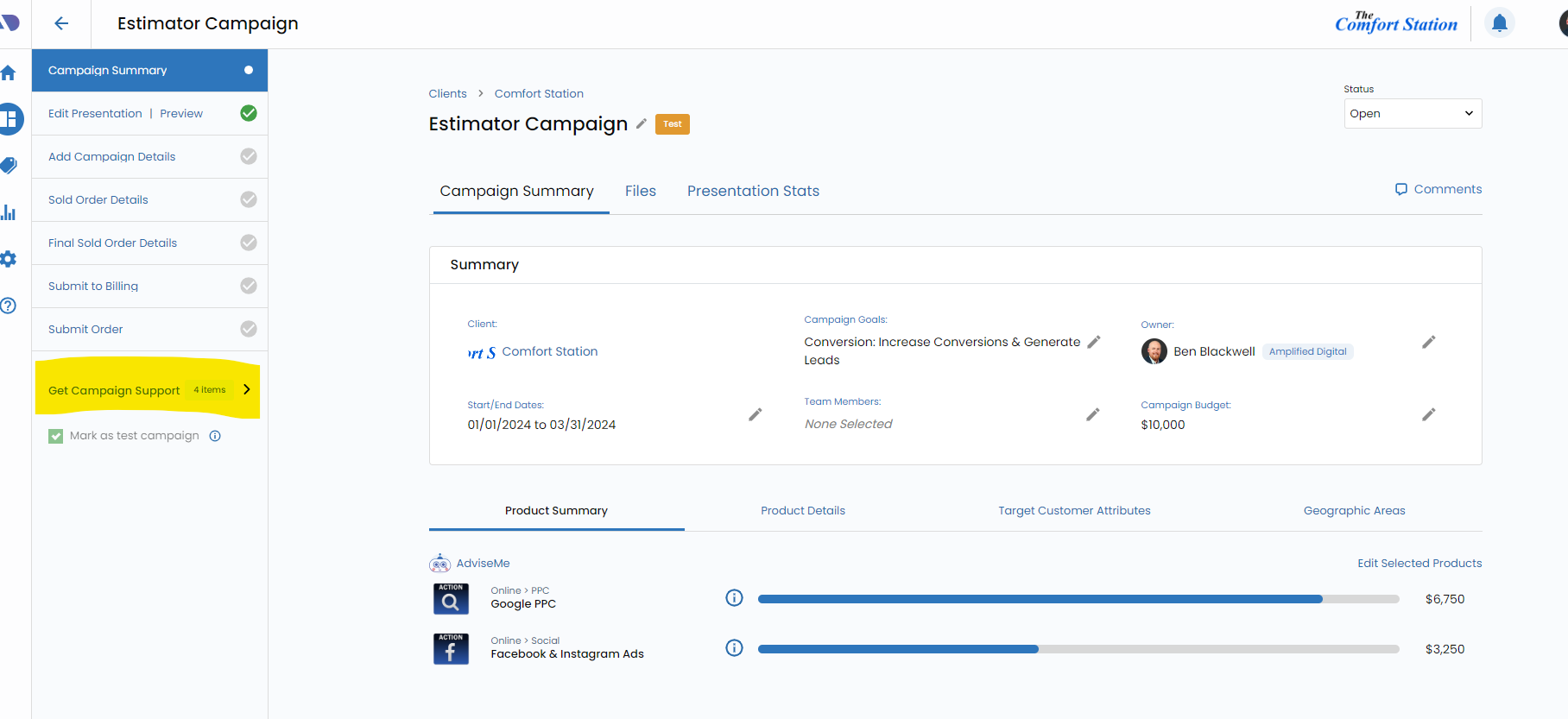 Within the Campaign Support Widget, locate and click on the "Instant PPC Estimator" option. This will launch the tool and allow you to input parameters for the estimation.