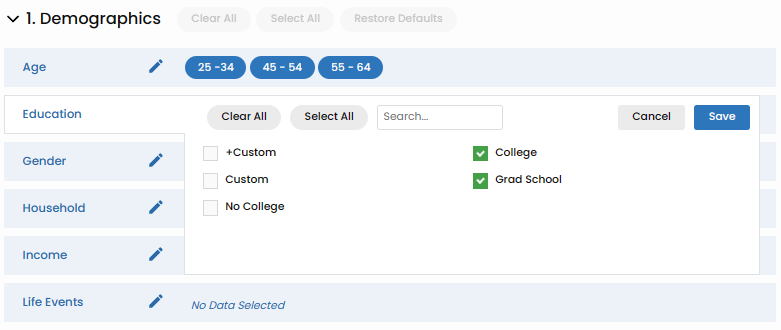 Tailor your campaign to specific education levels using Vision VX's education targeting functionality. Choose from predefined education categories, or for more nuanced targeting, utilize the 'Custom' option to define a bespoke education range for your campaign.