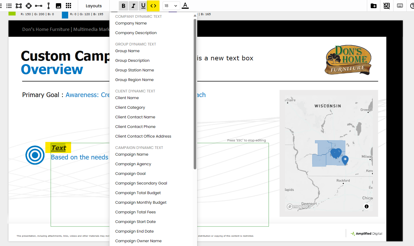 Specifically, you want to dynamically feature the client's name and the overarching goal of the campaign within the text elements.