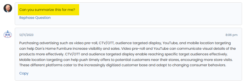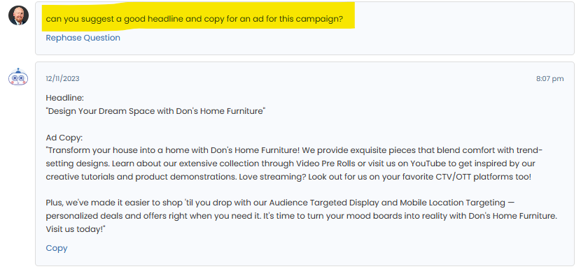 By fostering a dynamic conversation between users and the AI, advertisers can harness a wealth of knowledge, receive tailored creative suggestions, and gain a deeper understanding of their campaign's landscape.